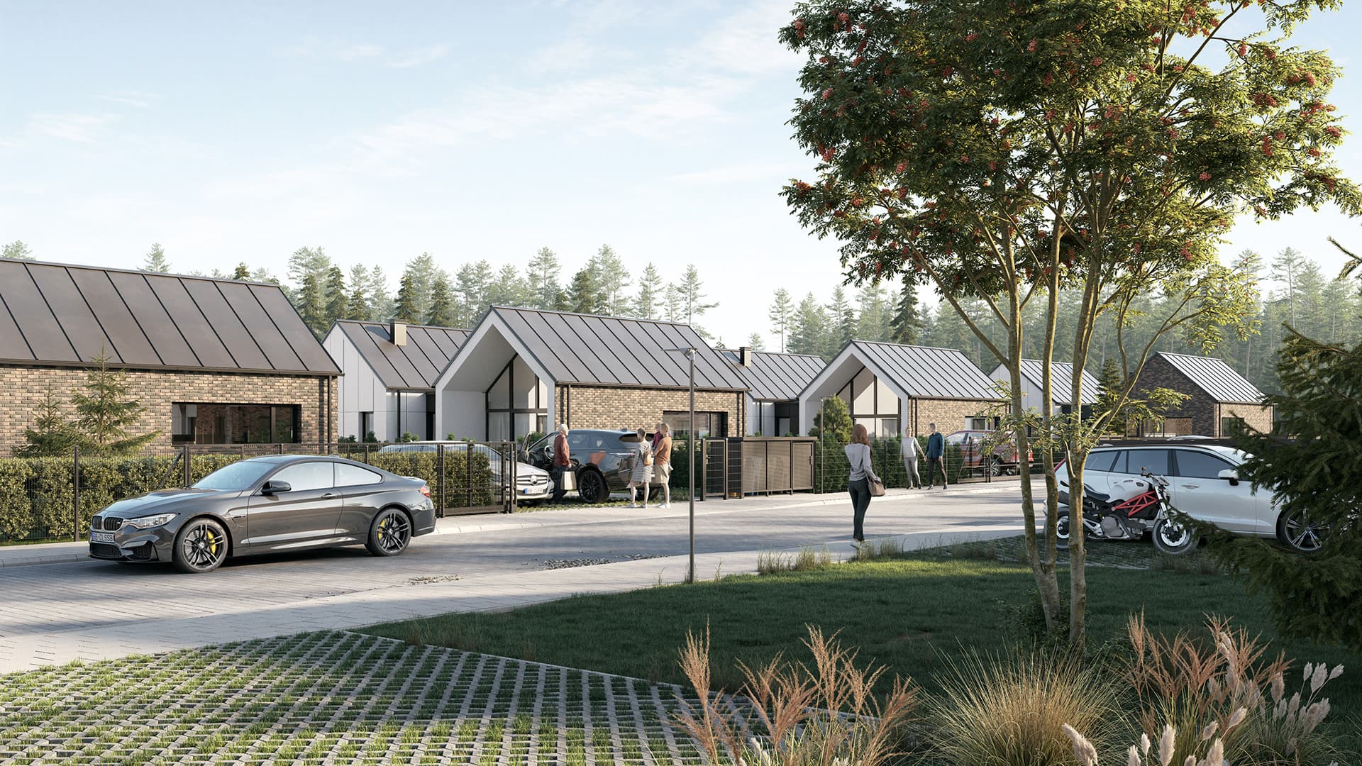 Bryły budynków z elewacją w formie klasycznej cegły nawiązują do tradycyjnej architektury, by — patrząc z drugiej strony — zaskoczyć na wskroś nowoczesnym designem fasady. Efektowne okna rozciągające się od parteru po spadzisty dach wychodzą na okazały ogródek — powierzchnia działek to minimum 1000 m². Wypoczynek na tarasie ocienionym przez drzewa uprzyjemni czas szczególnie letnią porą, podobnie jak basen i tereny rekreacyjne znajdujące się w obrębie osiedla. W chłodniejsze dni komfort zapewnią wnętrza ogrzewane pompą ciepła i podgrzewane podłogi w standardzie. Z myślą o wygodzie mieszkańców powstała też infrastruktura obejmująca między innymi przedszkole i sklep na terenie inwestycji.